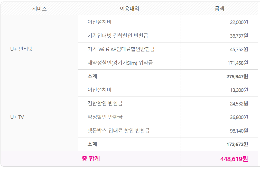 1. 인터넷 해지시 발생하는 위약금이 아래와 같은게 맞습니까? 원단위까진 필요 없고 대략적으로 액수가 비슷한지만 알면 될 것 같습니다. 이전 설치비는 최근 이사로 발생하였습니다.