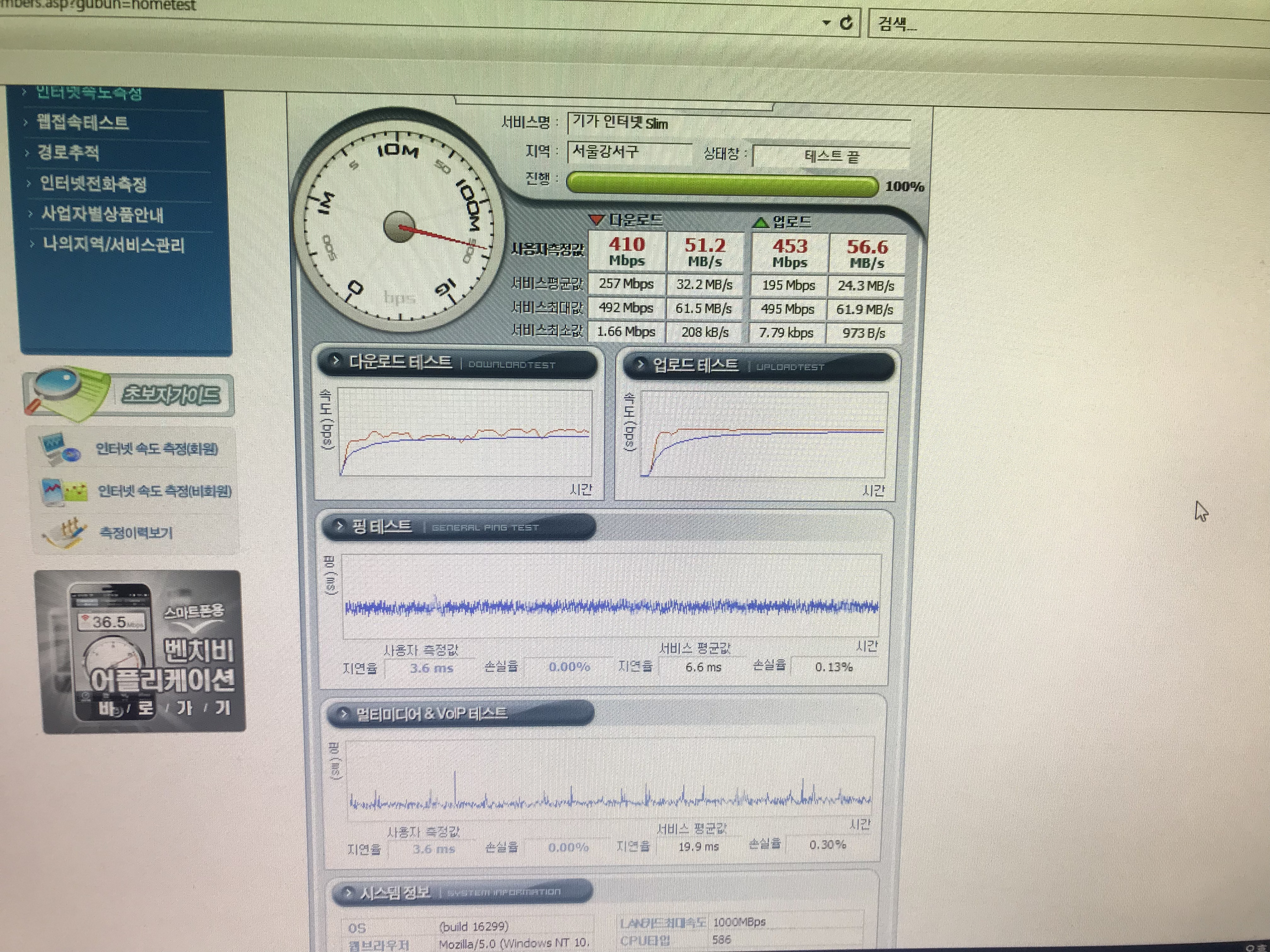 여기로 들어가셔서 평균 다운로드 속도와 업로드 속도, 지연속도 등을 체크해주시겠어요~? ^^