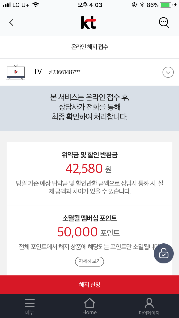 KT앱에서 조회되는 아래 금액에다가 백메가에서 받은 설치비를 더한게 해지할때 발생하는 금액이라고 생각하면 되나요? (42580 + 30000 = 72580원)