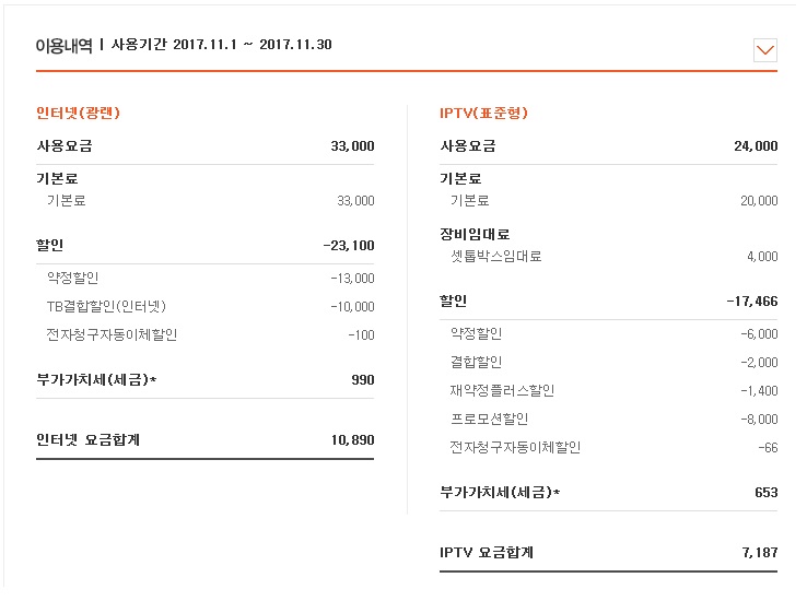skb로 인터넷 티비 이용중이고 온가족할인 50% 받는걸로 알고 있습니다