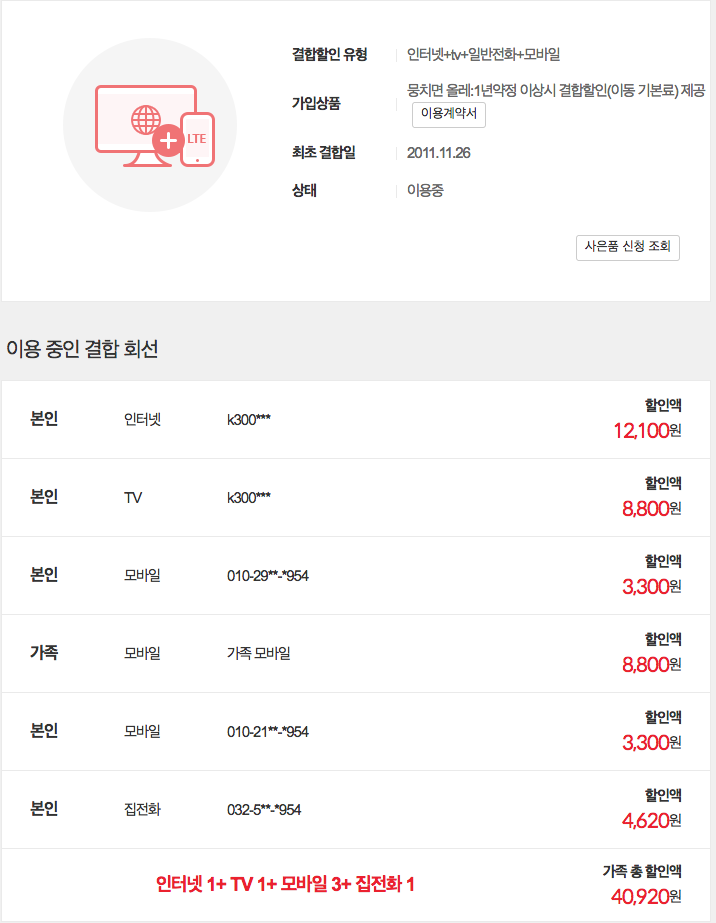 2) 가족분들 KT휴대폰도 총 3회선 결합하여 할인받고 계시고