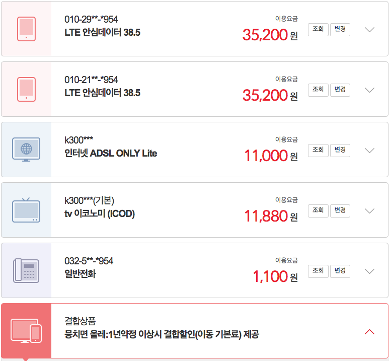 현재 KT에서 인터넷, TV, 전화를 사용하고 있구요, 핸드폰 결합을 아래와 같이 걸어서 해택을 받고 있습니다.