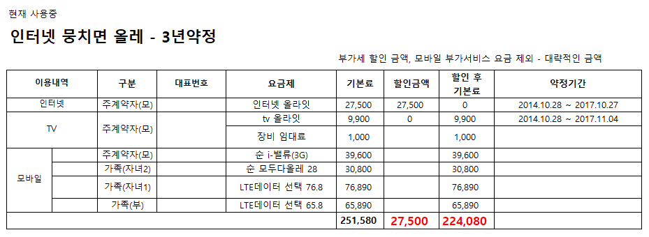 17년 8월 경 가족 모바일 1회선 추가 결합으로 모바일 4회선이 되었습니다.