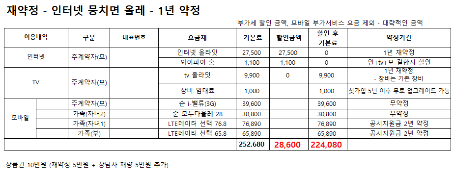 (상담사님에 대한 얘기는 안했고, 총액 결합+프리미엄 가족 결합 시, 3년 재약정에 따른 추가 혜택이 있는지만 물어보았어요..)