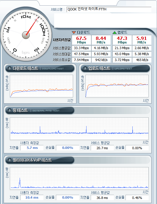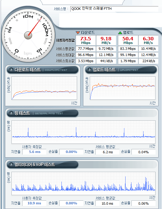 하여, 업로드, 다운로드, 핑(PING)의 결과를