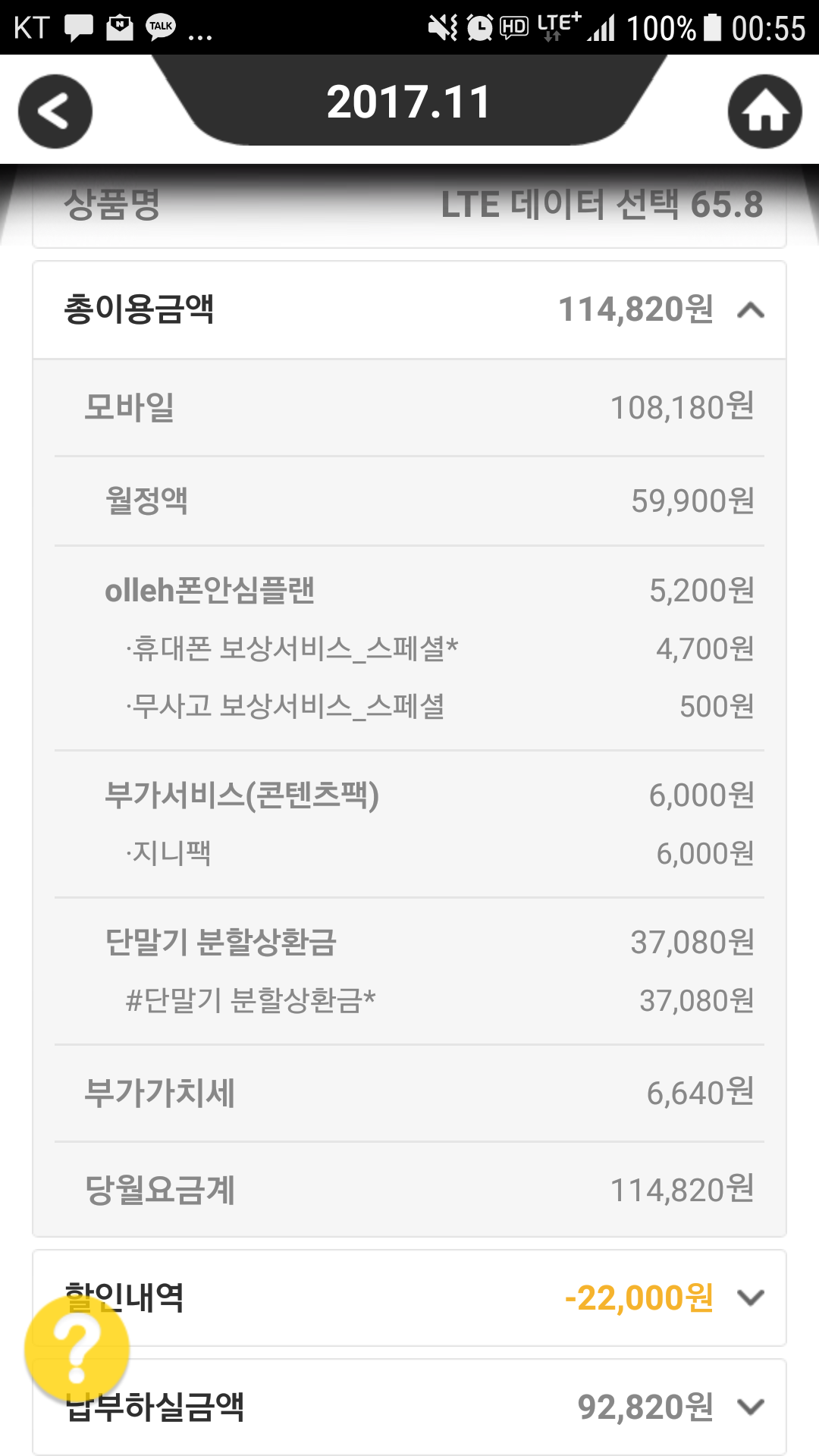 -> KT휴대폰 사용 중이구요. 상품은 "LTE 데이터 선택 65.8" 사용중 입니다.