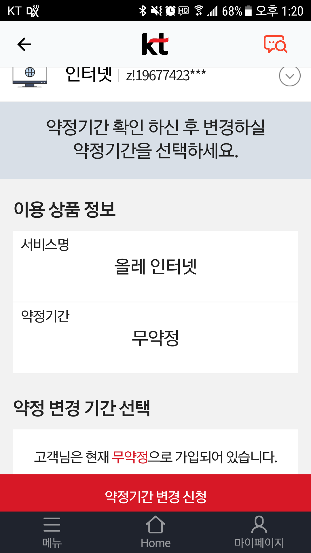 현재 무약정으로 가입되어 있다고 표기되어있습니다.