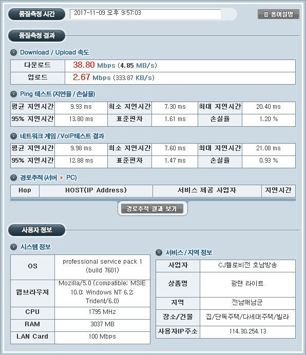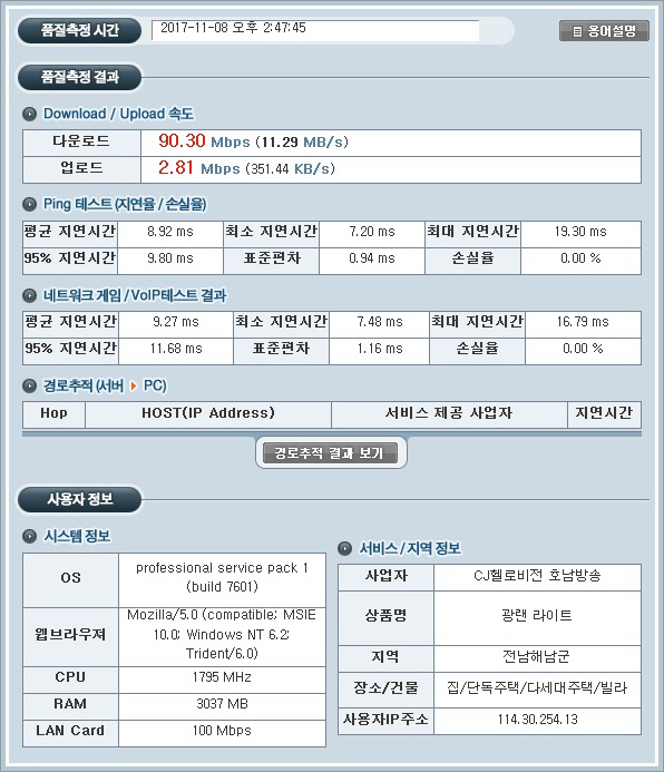민원을 넣으실 때에는 인터넷 속도 측정 결과물과,