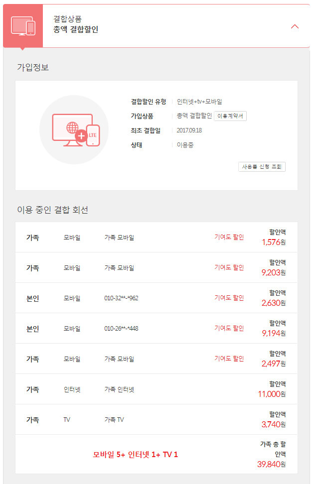 총액결합할인은 이름 그대로 결합 가능한 핸드폰 요금제를