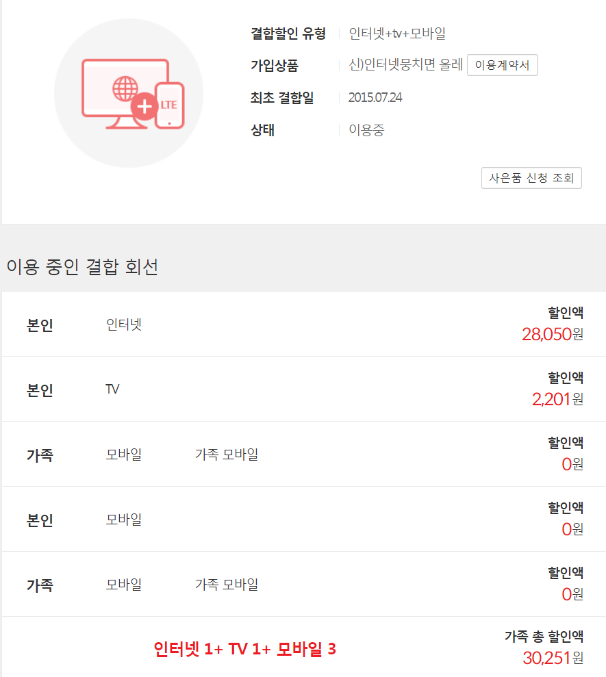 인터넷+핸드폰, 인터넷+TV 결합으로 요금할인을 받을 수 있지만