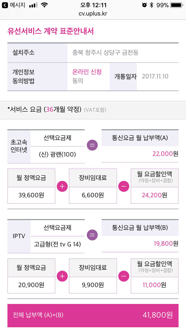 hcn은 광랜이 안들어와서 그런지 인터넷이 100m라 엄청 느리게 쓰고 있습니다 알아보니 약정기간이 11월16일까지라 이번 기회에 lg인터넷+티비로 바꾸려고 생각하고 있습니다 (요금이 한달 17,000원 정도밖에 나오지 않아 참고 썼어요 ㅋㅋ) 현재 배우자+장모님 저까지 모두 핸드폰은 통신사 lg 사용하고 있구요 3인가족으로 묶여있습니다