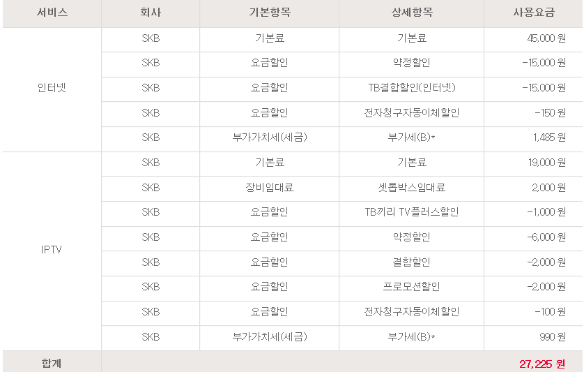 3년간 사용요금: 27,225원(월요금) x 36개월 = 980,100원