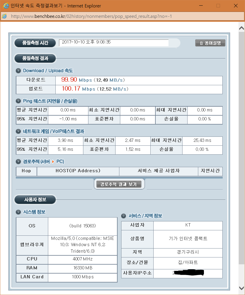(400메가급 속도는 KT사이트 측정 결과값을 말하는 것입니다.)