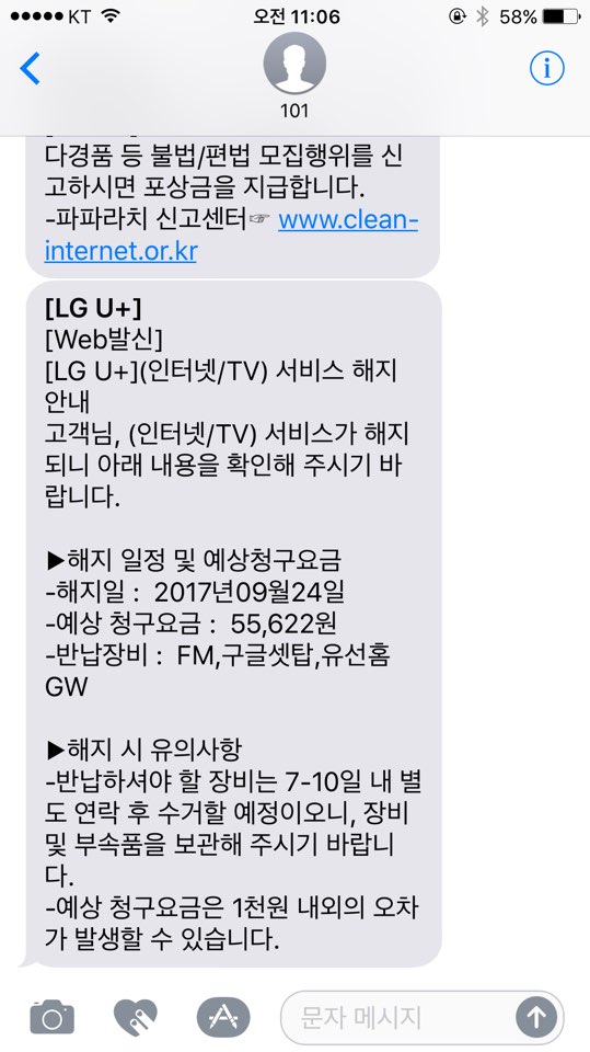 그런데 남편이 LG유플러스에서 이런 문자를 받았다고 하네요.