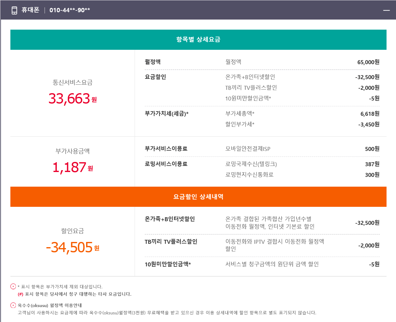 현재 제 인터넷 및 폰 통신비 현황입니다.