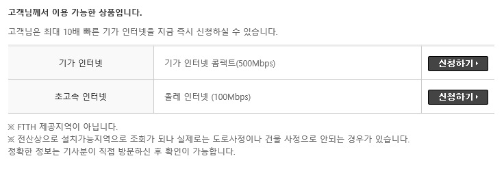 "FTTH 제공지역이 아닙니다." 라고 떠있어서