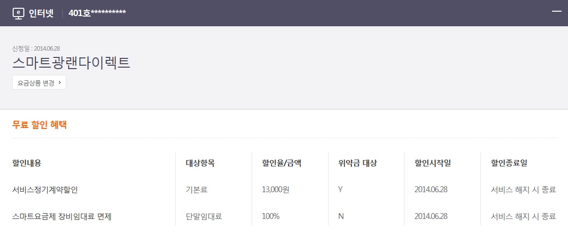 패밀리 적용이 풀리게 되며 인터넷 요금은 다이렉트(22,000원)이 아닌