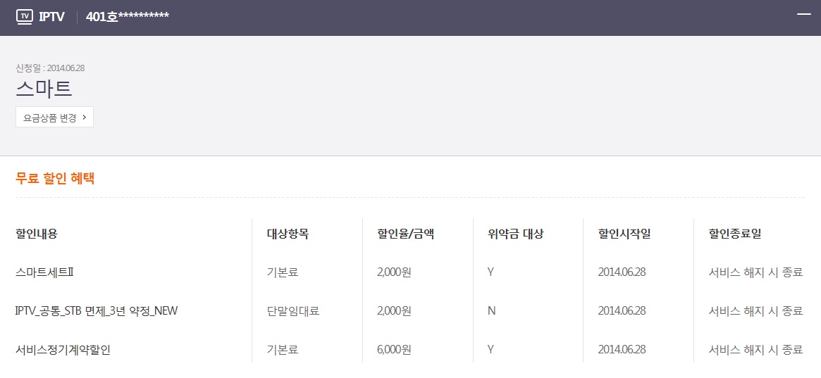 인터넷 + TV + 집전화 사용중인데, 약정 3년 지났습니다. (아래 스크린샷 참조)