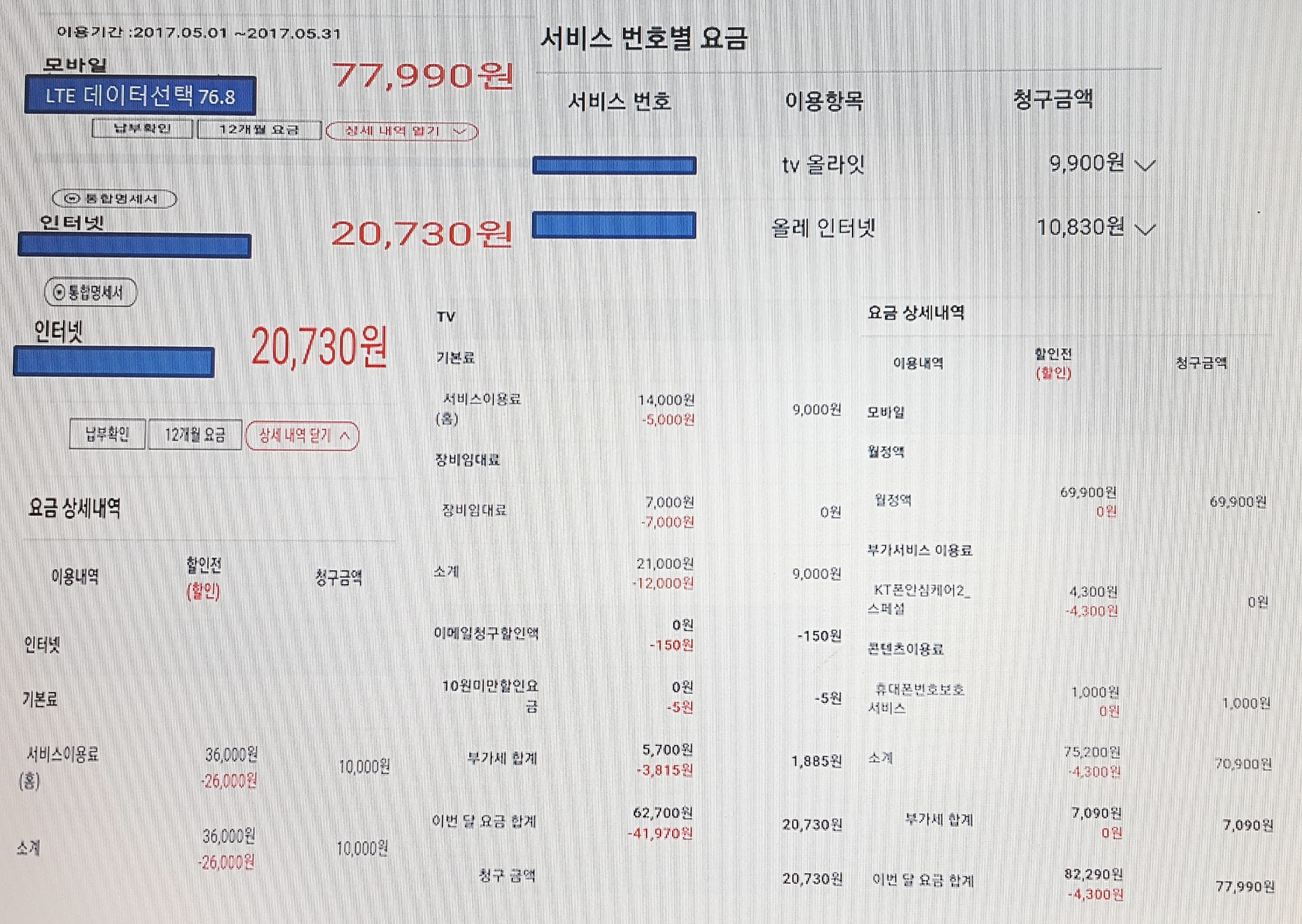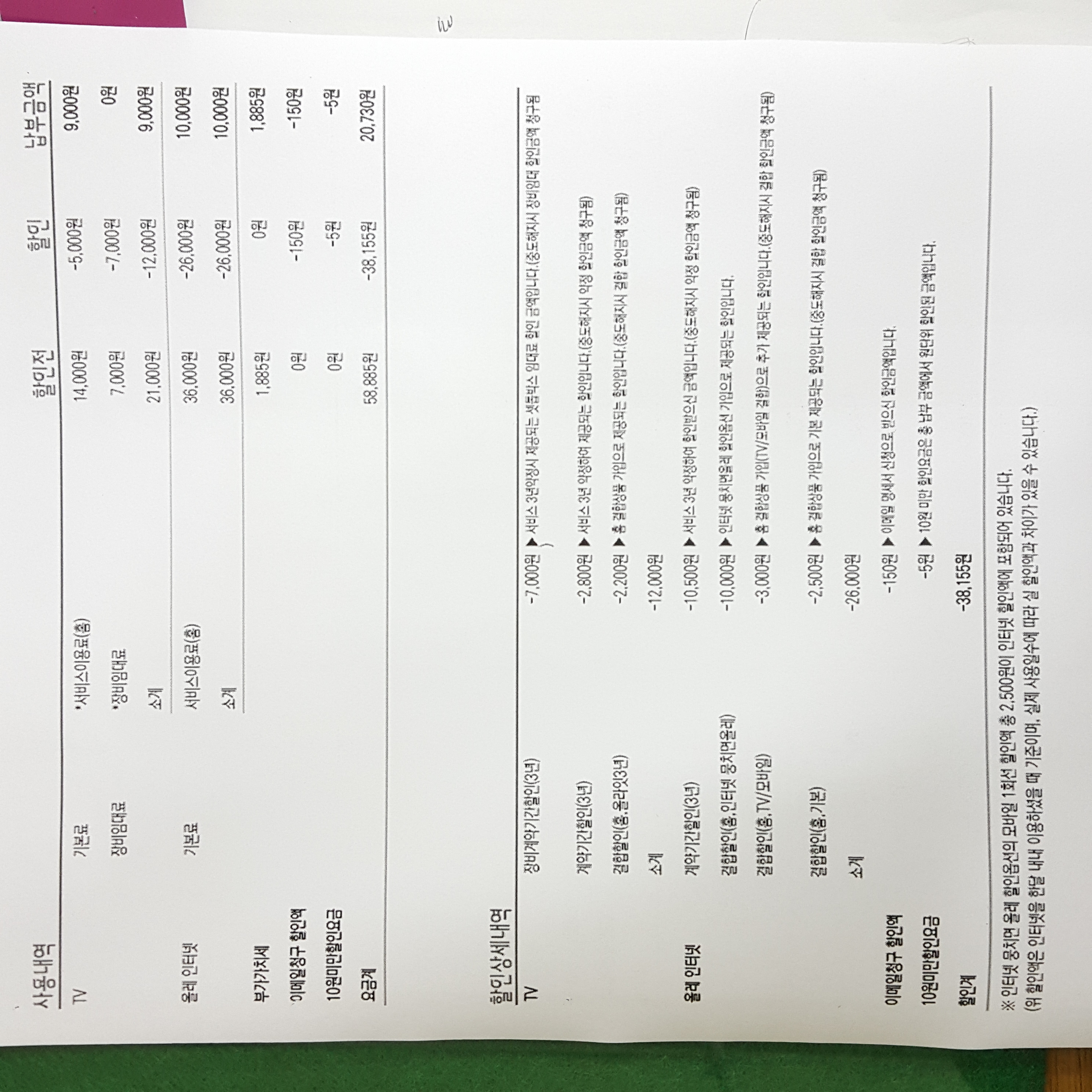 사진에 보시는봐와 같이 인터넷+TV+핸드폰 결합(인터넷뭉치면올레)사용중이었구요