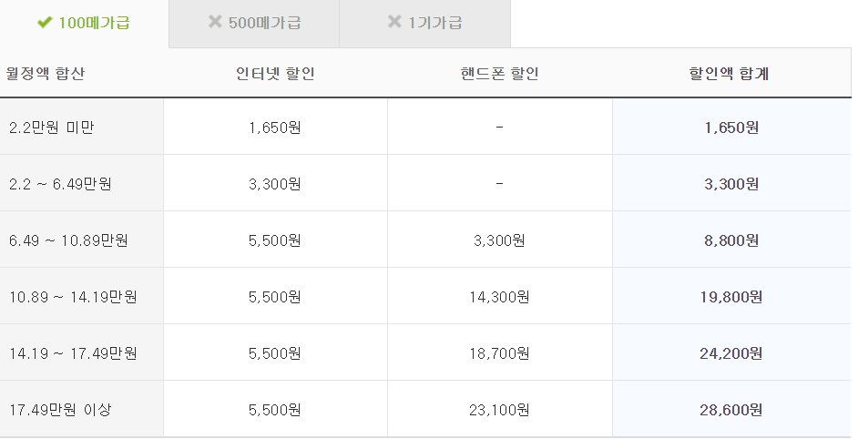 백메가에서 KT인터넷 총액 결합할인을 설명하는 위 표에서 볼 수 있는 것처럼,