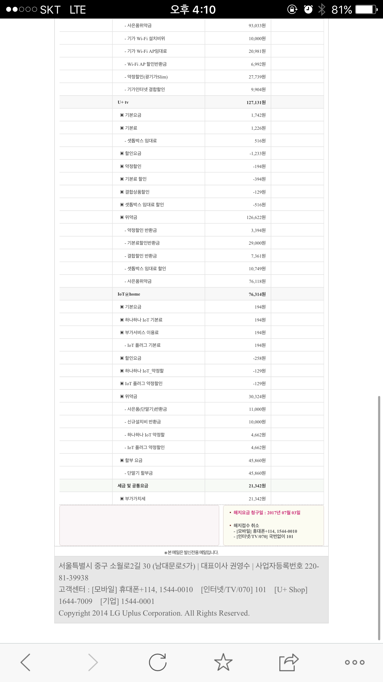 티비같은경우는 셋톱박스문제인지 화면전환이나 재부팅시 로딩이 상당히 오래걸리구요 채널마다 소리크기가 제각각이라 불편하구요 위약금은 아직 확인하지 못햇네요