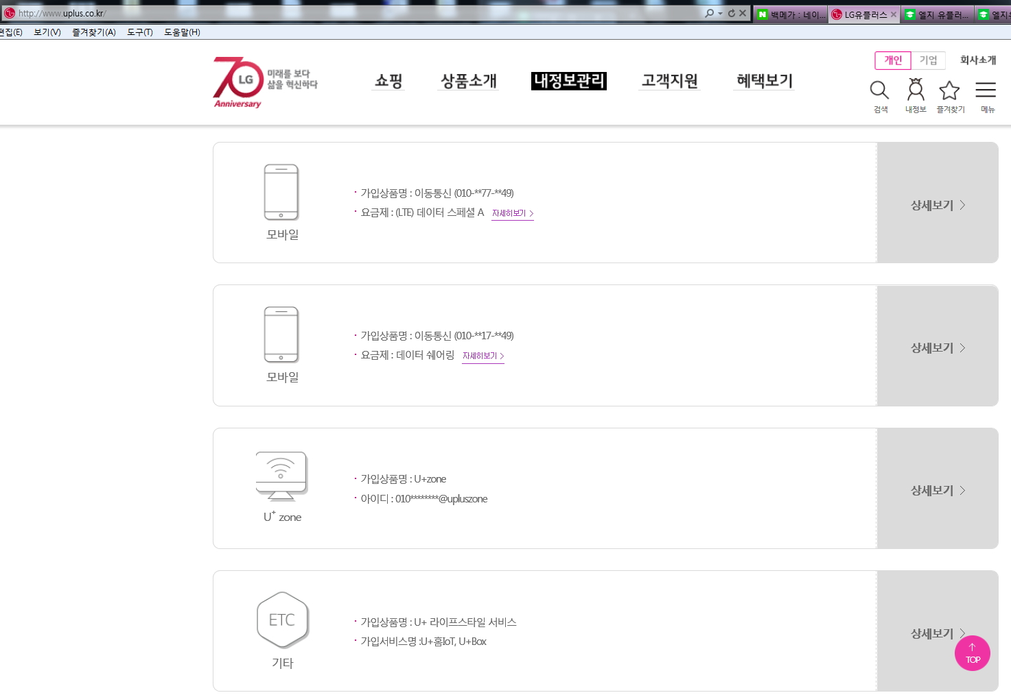 하지만, 인터넷의 경우 해지방어로 지쳐서 열이 받은 나머지 해지해서 유플러스 홈페이지에서 조회시에는
