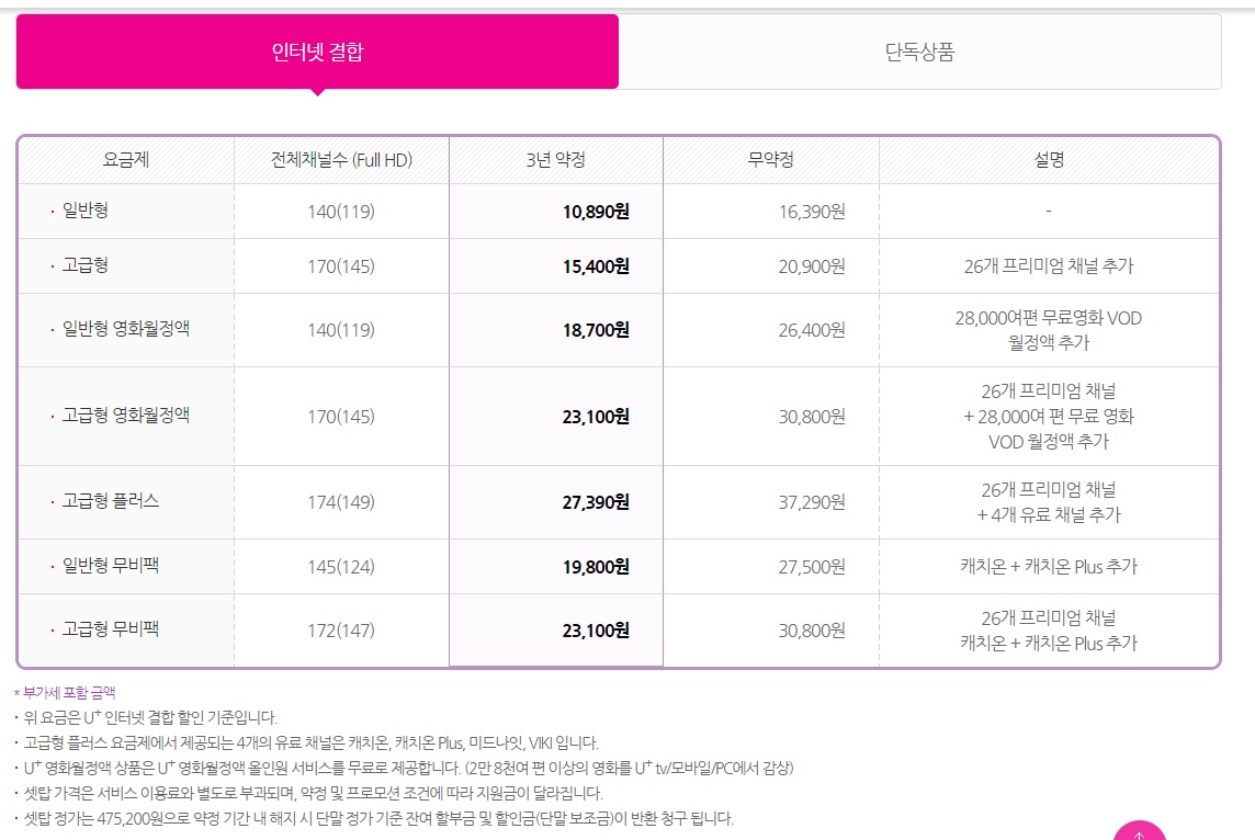 요금 및 VOD월정액이 추가되는 상품들은