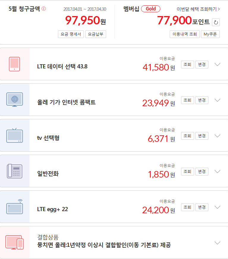 지금 현재 TV , 인터넷 , 모바일 , 유선전화 등을 KT로 이용중인데요