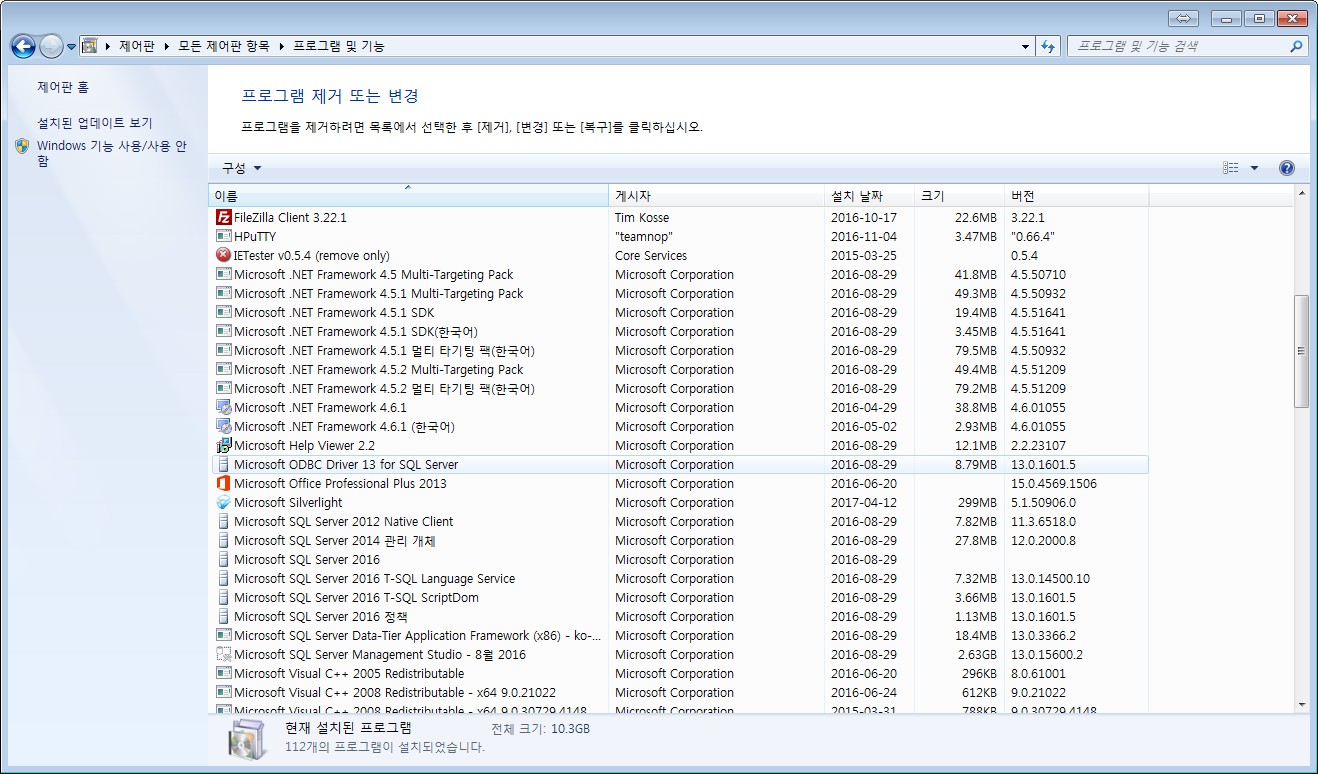 제어판 > 모든 제어판 항목 > 프로그램 및 기능의 항목들을 모~두 캡쳐해 주세요!