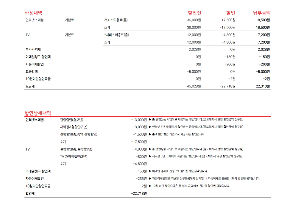 -설치비 : 인터넷 설치비 22,000원 + TV설치비 13,200원 => 총 35,200원 부과