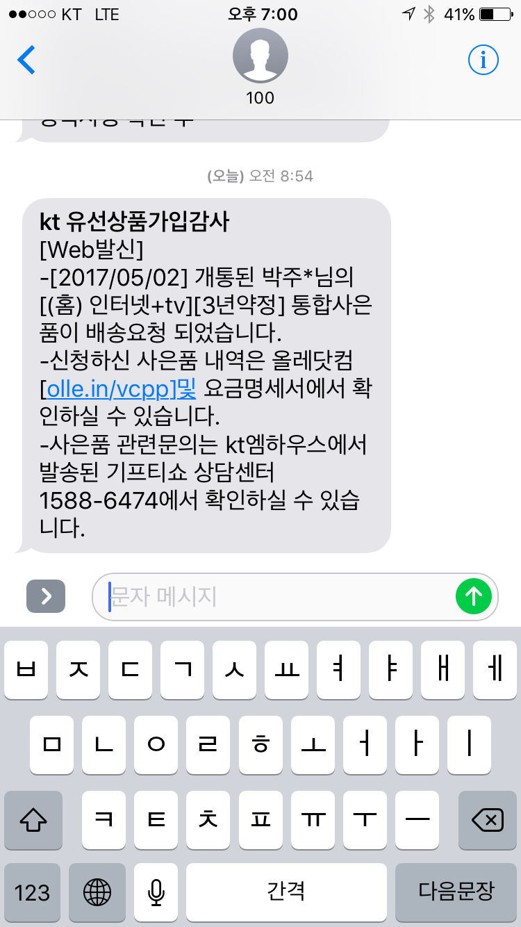 이는 인터넷 개통 후 모바일 상품권을 받으신 후에