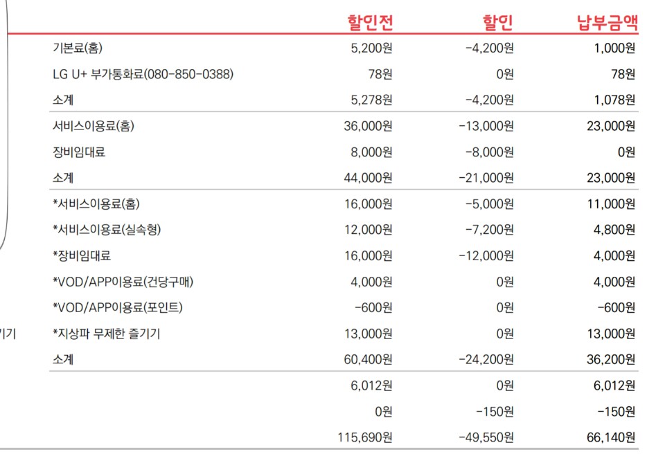 인터넷 + TV 2회선 + 일반전화 합해서 총 3만원 후반대의 요금이 부과되는데