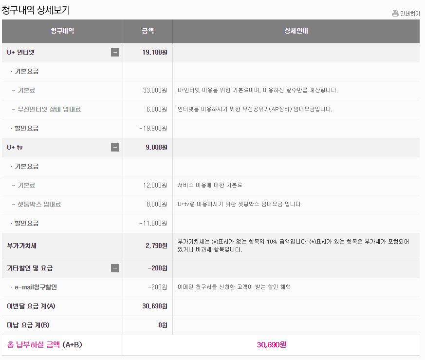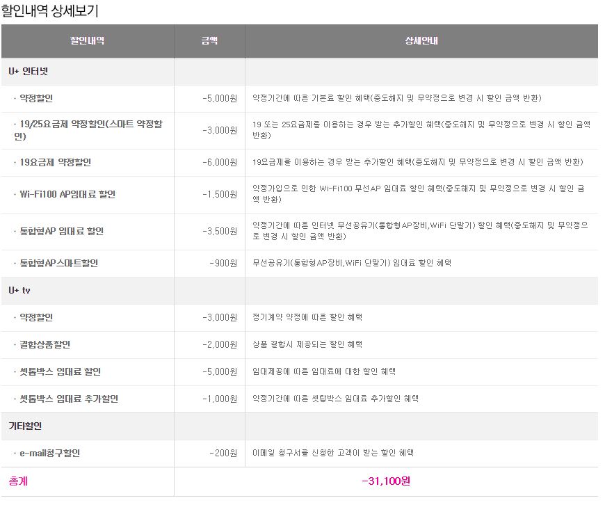 위 할인 내역 외에 현재 lgU+ 핸드폰 1회선 결합중이여서 해당 핸드폰요금에서 5000원씩 할인되고 있습니다.