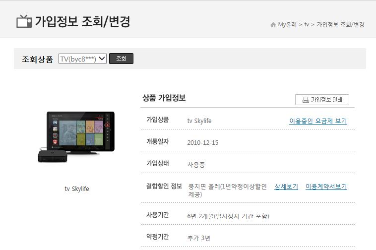 KT 인터넷 + 스카이라이프 상품과 집사람명의 핸드폰이 결합되어 있어,