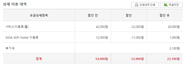 (기가와이파이 임대비도 3,300원인데, 아마 할인이나 면제 혜택을 받으신 게 아닌가 싶어요!)