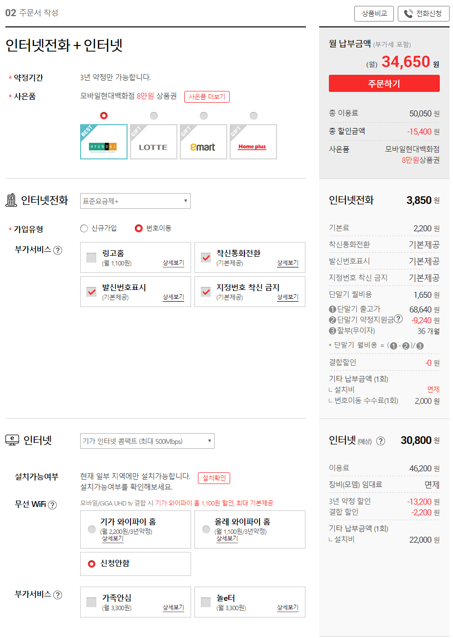 500M인터넷 + 인터넷전화 = 33550원으로 나와있습니다.