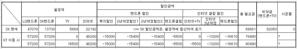 --LG인터넷을 SK로 변경하는 것도 방법이겠으나, 변경 시 할인금액면에서 큰메리트가 없고, SK의 비대칭 인터넷에서 벗어나고자 하여 KT로 생각했습니다.