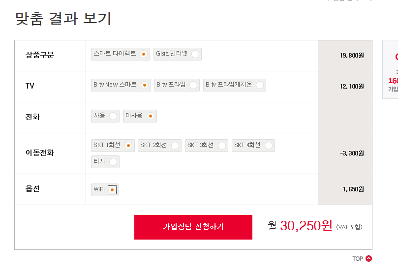 위의 조건으로 바로 인터넷 신청을 원하신다면