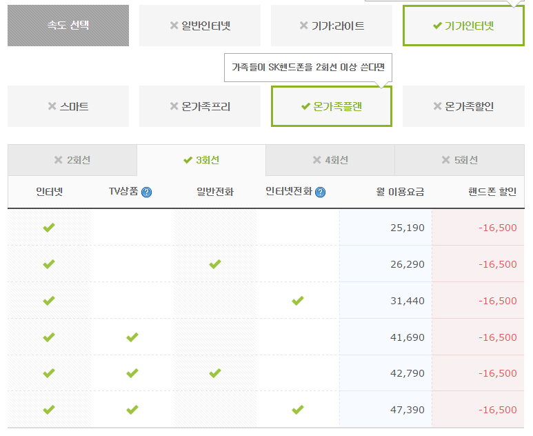SKT 온가족플랜 3회선 결합 + 기가인터넷 + TV 2회선