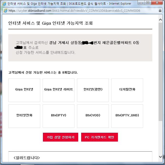 홈페이지에 설치가능여부 조회는 오류가 많다고 합니다 ㅠㅠ