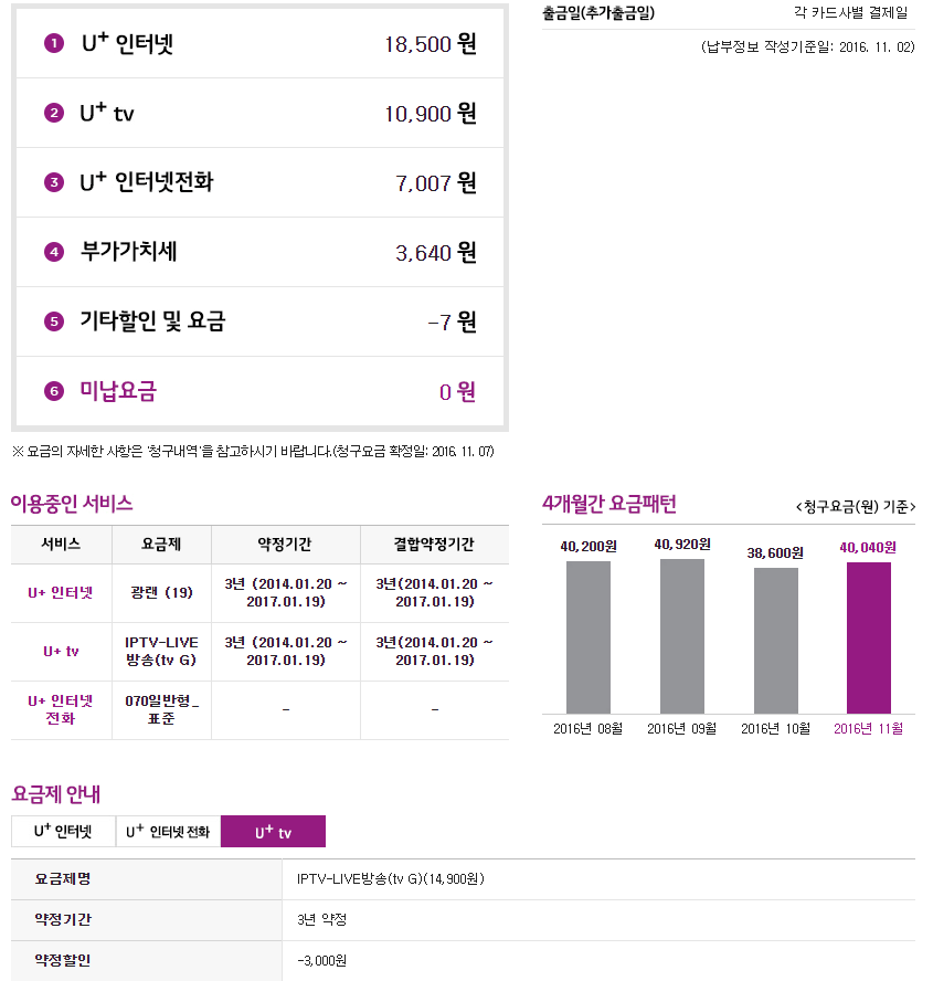 안녕하세요. 1월 19일에 기존 엘지 약정기간이 끝납니다. 기존 사용내역은 아래와 같아요