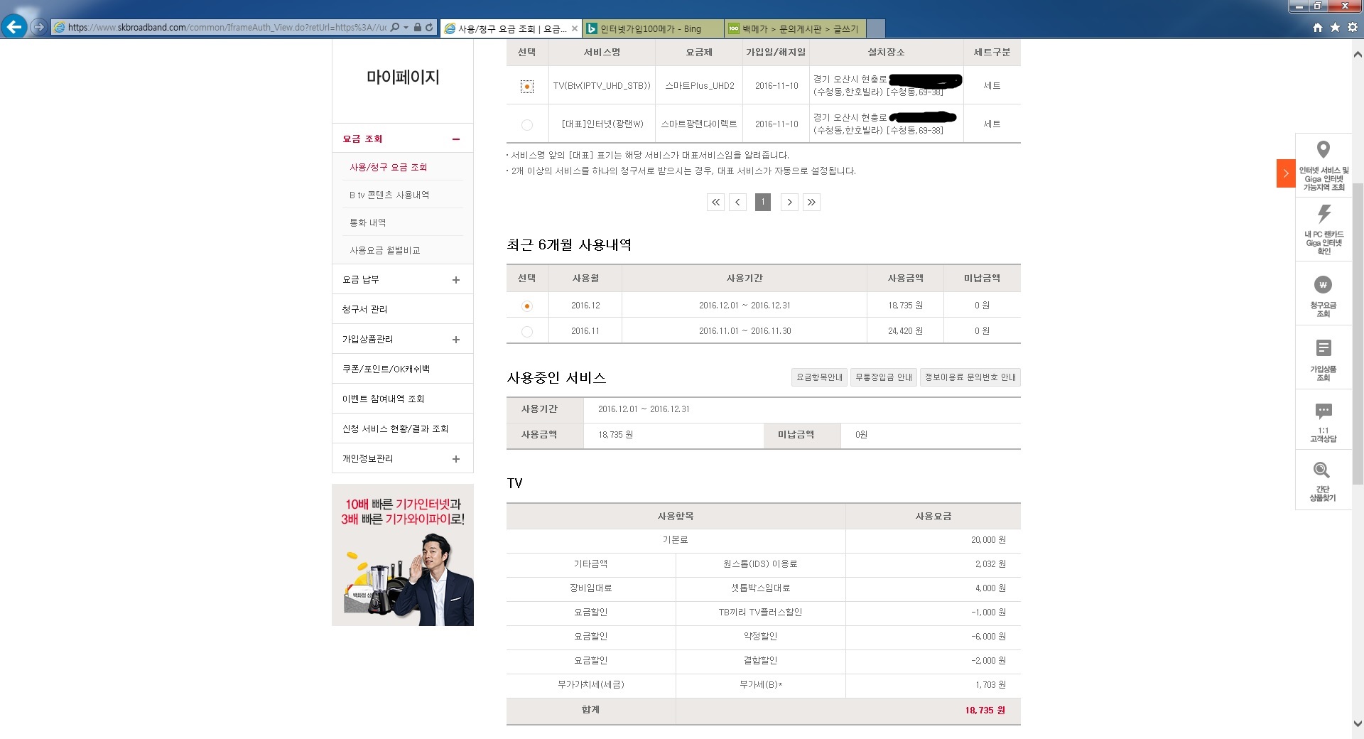 백메가를 통해 11월 SK인터넷과 TV를 가입해주셨는데