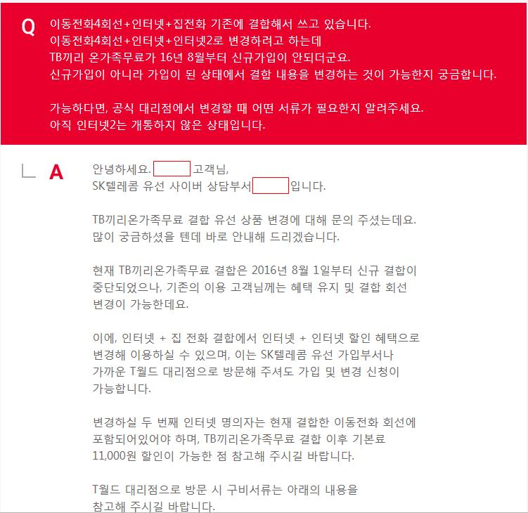 sk인터넷 신규가입 재문의 드려요(온가족무료)