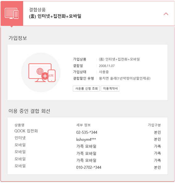 저희 집은 이렇게 가족이 4명이나 결합되어 있습니다. 물론 약정은 끝난지 한참 지났구요