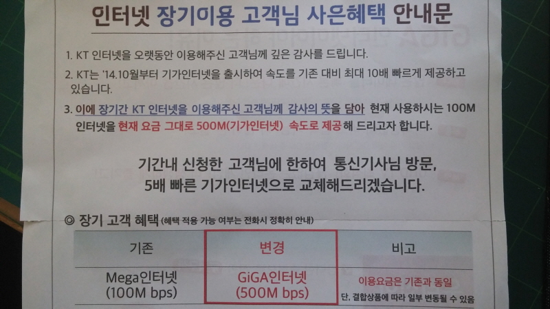 최근에 KT에서 단순히 속도만 변경해 준다는 저런 편지가 왔습니다.