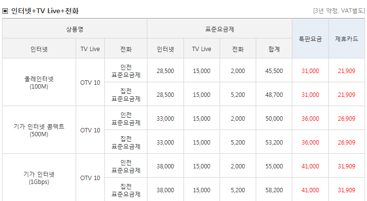 만약에 저 요금표대로 500메가급 인터넷 + OTV10 (UHD) + 집전화를 가입하신다면
