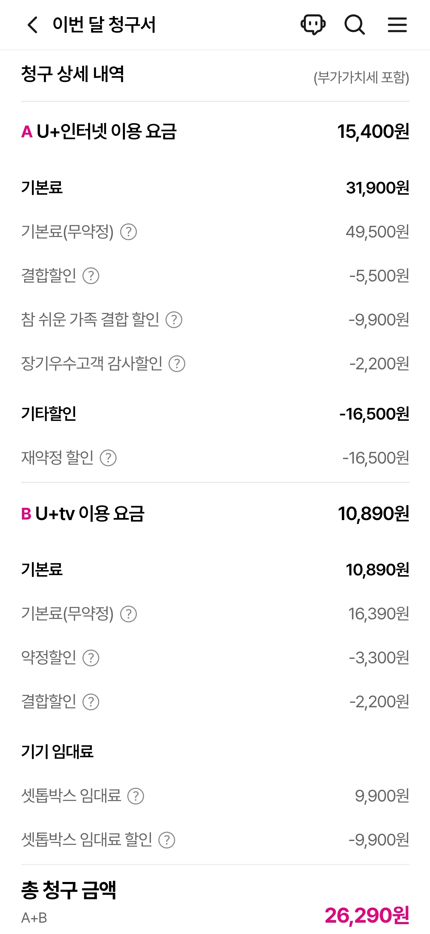 그리고 확인해보니 약정이 끝나기 전까지는 저기서 기가인터넷 할인이라고 3300원을  더 할인받았었어요
