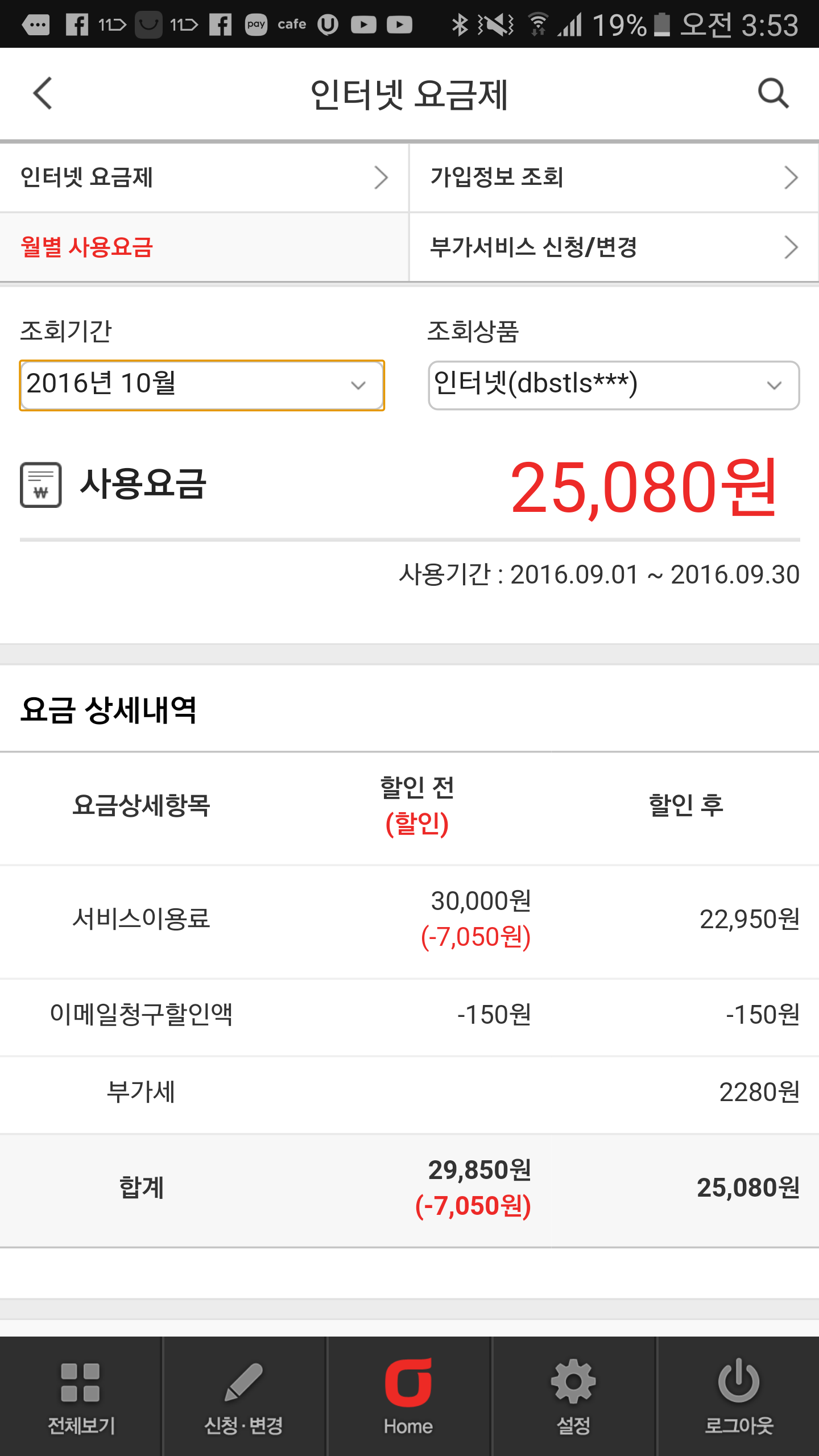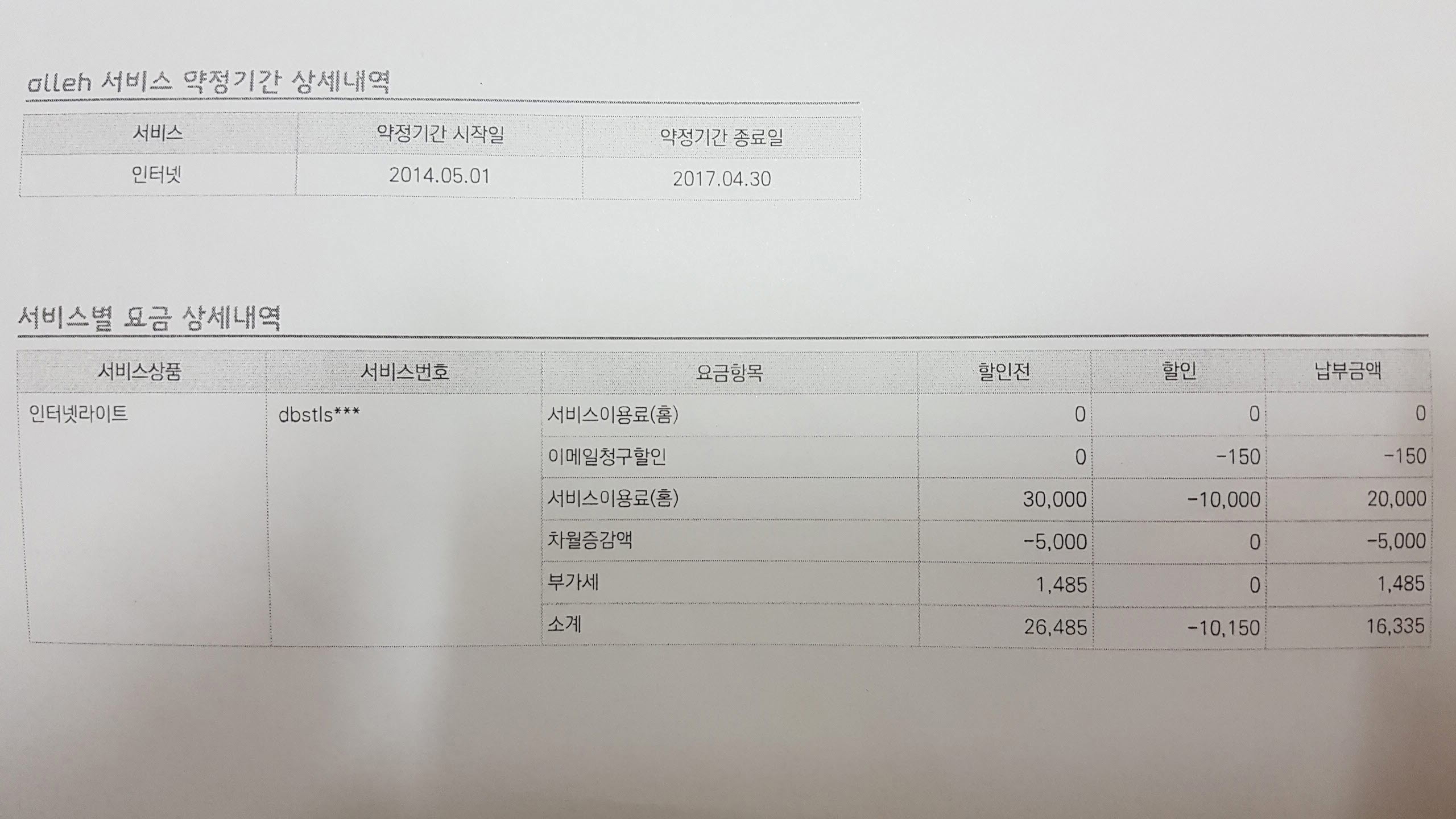 kt회선 2개 뭉올 쓰고 있었고, 떼를 써서 1년동안 5000원 할인받아서 요금 16000원대 나오다가...