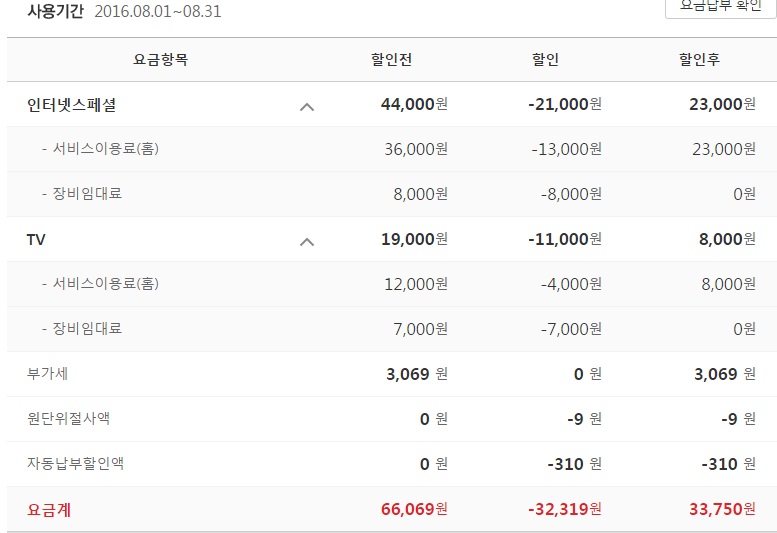 (휴대폰은 결합할인 내역이 보이는데, 인터넷과 TV는 결합할인 내역이 안보이는데, 결합 할인이 된건지도 궁금합니다.