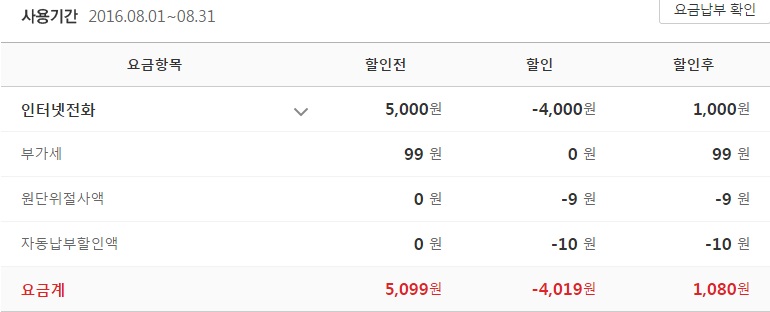 아래 그림은 8월 인터넷+TV+인터넷전화 요금표 입니다.